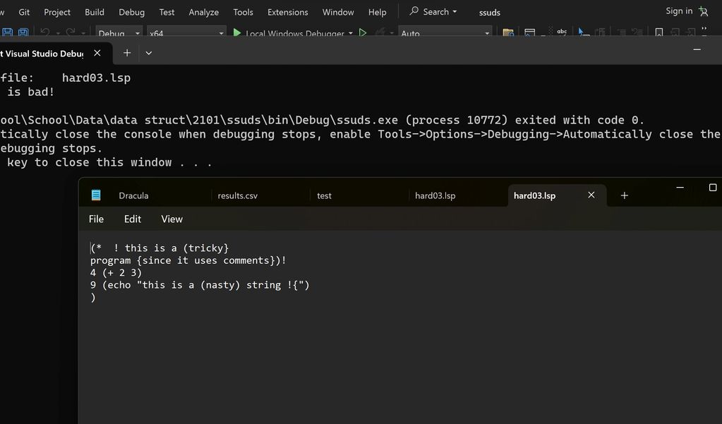 This project was an experiment in remaking custom, templated version of common data types and then applying them in various ways. One of my favorites were the delimiter analyzer which parsed files looking for syntax errors (shown in image) and returned the result.